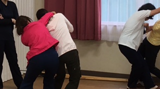 警察の方をお招きし、幼稚園やいきいきの先生も一緒に刺股などの道具を使った防犯訓練を実施しました。子供達の命や安全を守るために、こうした道具をどう扱うかを教えていただきました。