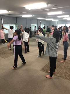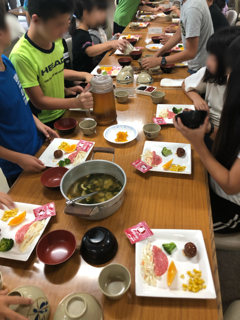 雨のため、宿舎内で朝のつどいを行ったあと朝食を食べます。