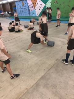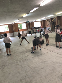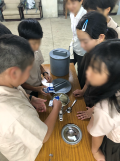 各班でバニラ味かココア味どちらかを選び食材を混ぜて氷の入ったバケツに入れ転がします。