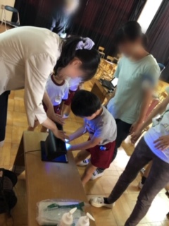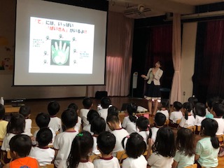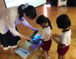 幼稚園では、日々、手洗いうがいを励行しています。今日は、改めて、手洗いうがいの大切さを学びました。特殊なクリームを手にぬり、ブラックライトを当てると白く光る。手洗い後にまた当てて白く光らなければ手洗いOK。目で見て分かるので、どこが洗えてないか知ることができ、今後、気をつけて洗えるように指導していきたいと思います。