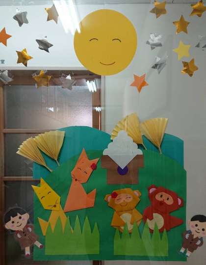 給食調理室の飾りは、すっかり秋です。お月見してる動物たちの可愛い掲示になりました。