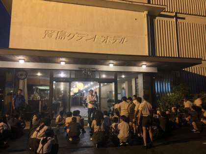 ホテルに着いて、宿の方に挨拶をし、早速、避難訓練を実施しました。