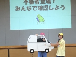 車からの誘いから逃げる方法、ランドセルを掴まれたときに逃げる方法、車のナンバーを覚えることなど、防犯に必要な情報を学びました。ランドセルを背負ったまま逃げるのは大変なので、そんな時はランドセルを放り出してもよいということでした。こんなことはないに越したことはありませんが、もしかのためにしっかりと心に留めておいてほしい学びでした。