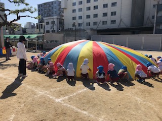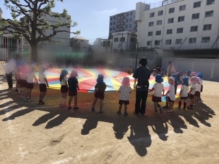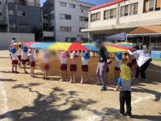 土曜日にミニ運動会を終え、予備日の今日、そらぐみがさくらぐみにパラバルーンを教えて一緒に楽しみました。来年は、自分たちがするぞ、と、また、楽しみが増えたようです。