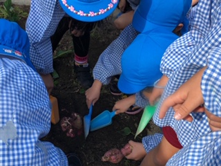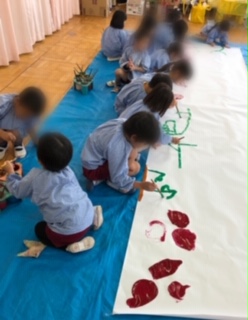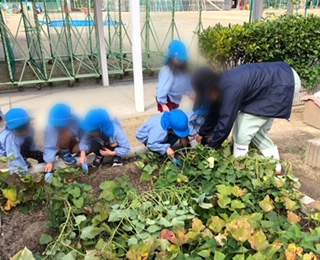 今日は、そらぐみが、畑のサツマイモを掘りました。蔓が長い、葉っぱがハートの形、おいもがつながってる、など、発見がいっぱい。大きなおいもを力を合わせて掘ったり、大きさや長さを比べたり、収穫を肌で感じていました。その後、大きな紙に体験したことを絵の具で描きました。