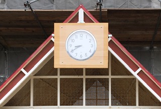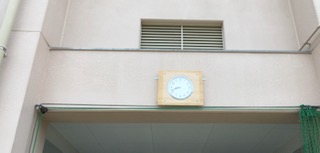 校舎の壁塗装のために、壁面についていた時計も幌に隠されてしまいました。管理作業員さんに相談したところ、こんなに素敵に時計を2箇所付けてもらうことができました。自分の目で時間を確かめることができるので、子供達も安心して運動場での活動ができています。