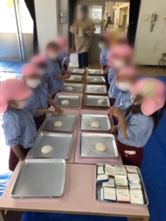 つきたてのおもちは、温かくフワモチ。幼稚園用の鏡餅を見せてもらい、自分だけの鏡餅をつくりました。いよいよ、そら組の出番です。