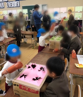 今日は、併設の東中本小学校に遊びめぐりに行きました。1クラス3グループに分かれて、限られた時間でしたが、校舎をめぐり、空気砲、もぐら叩き、宝探しなど、めいいっぱい楽しませてもらいました。小学生に優しく教えてもらい笑顔いっぱいでした。