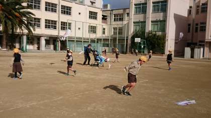 生活課で作ったタコをあげました。風は少し冷たかったのですが、凧揚げにはいい感じの風が吹き、それぞれに凧揚げを楽しめたようです。