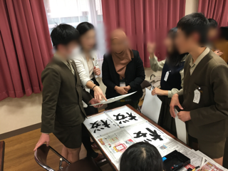 次に、1組は図工室で水墨画を、2組は多目的室で習字を披露して、その後研修員の皆さんに体験してもらいました。