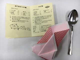 プレゼントは給食のスプーン。一年毎に卒業生の分は廃棄されるそうで、それを記念に1人に一本ずつ、人気メニューのしおりと共に包装されていました。思い出の一つになりますね、きっと。