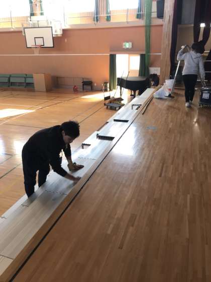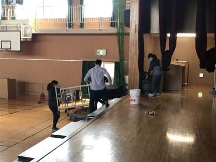 市教委から新しい指示は届いていませんが、学校では今日、講堂のワックスがけや卒業のお祝い掲示の貼り替えなどを行いました。卒業式の読み上げ台帳なども準備を終えました。
