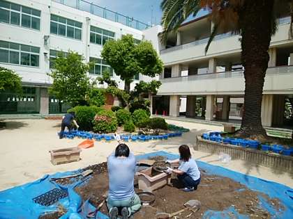 ↑明日の登校日に向けて、2年生の先生方と管理作業員さんが、植木鉢の準備をしています。