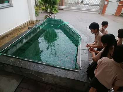 写真は学校の人気物。門を過ぎた所にいる鯉です!管理作業員さんに餌をもらって、餌をあげています。