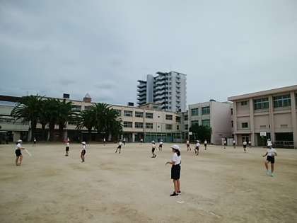 (↑今日は台風の影響か、曇り空だったので、久しぶりに運動場で体育をするクラスが多かったです!5年生の体育の様子ですが、運動場を広く使って一人一人の距離を離して行っています!!)