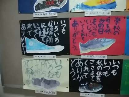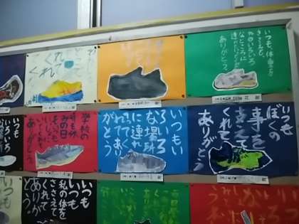 (↑4年生の掲示板の写真です。子どもたち一人一人の靴のイラストと、靴に対する子どもたちのメッセージが書かれています!是非、学校に来た際にはご覧ください!)