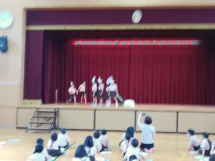 (↑1年生が講堂の舞台を使って、国語科の学習で「大きなかぶ」の劇をしていました!!)