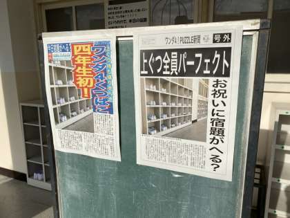 (↑上、4年生の先生方が新聞風の看板で子どもたちのがんばりを褒めておられました!これからもがんばってほしいです!!
