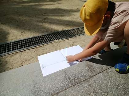下、3年生理科の実験の様子です!紙の上に棒を立て、影の長さをはかっています!休み時間もみんながんばっていましたよ!!)