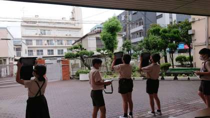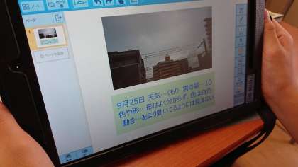 中・下、5年生理科の授業の様子。タブレットを使い空の写真を撮り、コメントを入れ記録しています。)