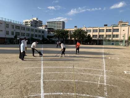 明日・明後日は体力テスト(ソフトボール投げ)があります。先生たちで放課後、ソフトボール投げのライン引きをしました!