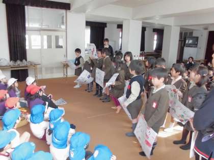 2月10日(火)、来年1年生になる東中本幼稚園と東中本保育所の子どもたちを招待して、保幼小の交流会が開かれました。