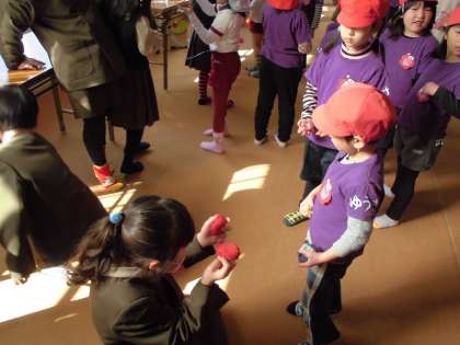 来年お兄さん、お姉さんになる1年生の子どもたちは、とても親切に「ここはこうして・・・」とあやとりを教えたり、「けん玉でいっしょに遊ぼうよ。」と呼び込みをしたりしていました。