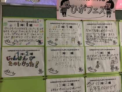 下の写真は、金曜日のスマイルひがなかフェスティバルの各クラスの感想です。6年生のみんなはもう見てくれましたか?まだの人は明日、職員室の前まで見に来てくださいね!