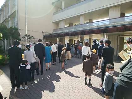 新型コロナウイルス対応で教室に児童と保護者の方に入っていただけないので、講堂にて1年生児童と保護者の方が同じ長椅子に座っていただくという形で実施しました。