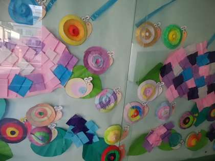そして、門を入ってすぐの掲示板はアジサイと4年生の子たちが作ってくれたカタツムリに変わりました!