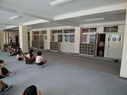 今日は天気がとても良く、1年生の体育ですが、元気に運動場でがんばっていました。写真には幼稚園の避難訓練の様子も写っています!