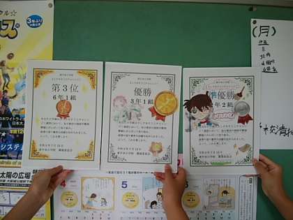 今朝の放送朝会ですが、2年生の男の子が昨年度PTAの三行詩で優秀賞に選ばれたということで、校長先生から表彰されました!また環境委員会からは「さしすせそうじチャレンジ」の点数が高かったクラスに賞状が送っていました!