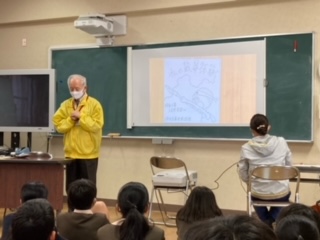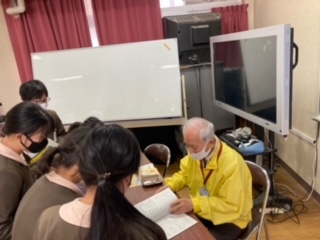 6年生、平和学習の様子。地域の方に来ていただき、戦争当時の様子について話していただきました!お話の後は班ごとの質問にもていねいにお答えいただきましたよ!!
