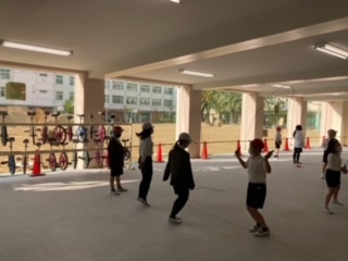 運動場の工事。そして、体育館も作品展の準備を行なっているので、なかなか体を思いっきり動かすことができていないのですが、写真のようにピロティで縄跳びをするなどして、体育の学習を行っています!
