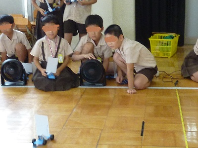 幼稚園の遊戯室を借り「風の力で動く車」の実験をしました。