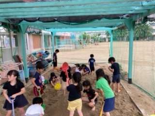 1年生、生活科の様子です。東中本幼稚園さんに砂場を借りて、泥んこ遊びをしました!密を防ぐために、クラスを半分に分けて実施しましたよ!