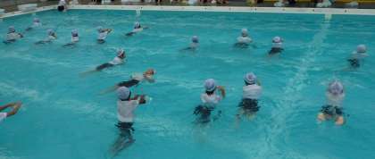 2年生はいつもの水着だけの泳ぎのあと、体操服を着て、水の中に入り、同じように泳げるかを試してみました。