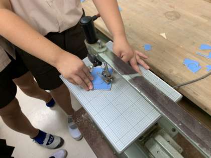 下の写真も5年生です。図工科、電動の糸ノコギリを使って作品を作っています!