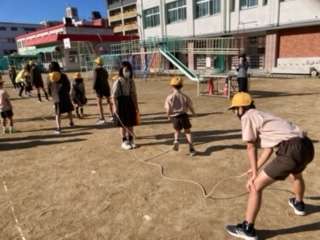 たてわり班ごとに8の字跳びに挑戦しました。低学年の子もくぐり抜けるだけでなく、果敢に挑戦していましたよ!!