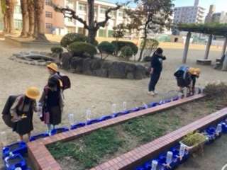 写真は一年生の下校の様子です。先週植えたチューリップに水やりをしています!