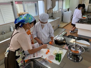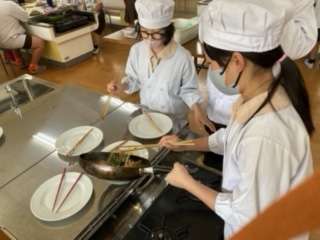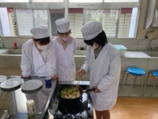 野菜炒めを作りましたが、ちゃんと火が通りやすいように、それぞれの野菜の切り方や炒める順番を各班工夫して行っていました。