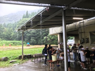通り雨に出くわしました。魚を食べるながら、雨宿りをしています。