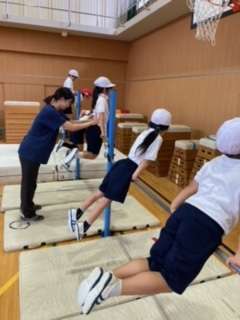 下の写真は、2年生体育科の様子です。東中本小学校では、運動場だけでなく、体育館でも鉄棒の練習ができます!下にセーフティーマットも引くことができ、難しい技にも果敢に挑戦していましたよ!