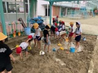 一年生、幼小交流、生活科「砂場あそび」の様子です。お隣の東中本幼稚園の砂場をお借りして、砂遊びを行いました。