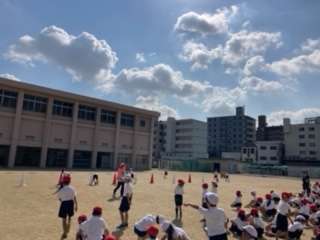 下の写真は、一年生の体育科の様子です。スポーツの秋、一年生は合同体育で、ボール遊びリレーを行いました。みんなとても楽しそうでしたよ!!