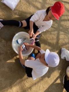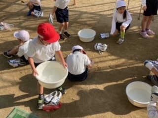 下は一年生、生活科で上靴を洗う実習を行いました!みんな、ゴシゴシきれいになるまで磨いていました。