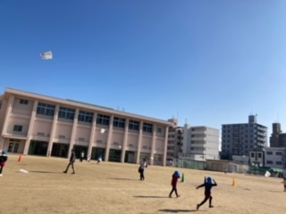 写真は、運動場で東中本幼稚園の園児が凧上げをしている様子です!
