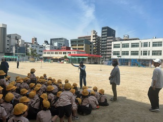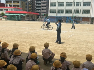 1、4年生、交通安全指導が行われました。東成警察署の方に来ていただき、1年生は正しい歩行の仕方、4年生は安全な自転車の乗り方について教えていただきました!実際の道路に見立てたコースを使って、一人一人体験しましたよ。