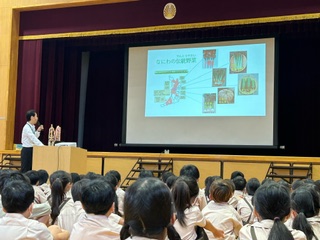 朝会では、なにわの伝統野菜について校長先生からお話がありました。地元である東成区で昔育てていた「玉造黒門越瓜(たまつくりくろもんしろうり)」を今後子どもたちも育てていく予定です!