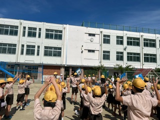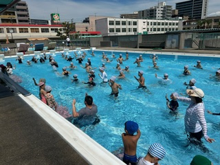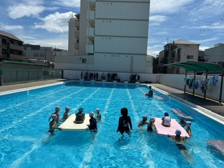 下は、5年生の幼小交流の様子です。小学校のプールで、エビカニクスを踊ったり、ムシムシじゃんけんをしたり、浮島を使って遊んだりしました。いつも隣で見ている大きなプールに入れて、幼稚園の子たちも嬉しそうでした!